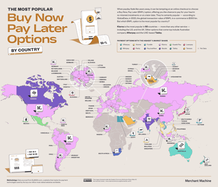 Tháng 8/2023, theo dữ liệu tổng hợp từ nền tảng phân tích BuildWith, trang Merchant Machine đã công bố bảng xếp hạng các doanh nghiệp “Mua trước - Trả sau” (BNPL) phổ biến nhất tại từng quốc gia trên thế giới. BuildWith được biết đến là hệ thống chuyên thu thập và phân tích thông tin về các phương thức thanh toán trực tuyến được tích hợp trên hàng triệu website toàn cầu, mang tính tham khảo đáng tin cậy cho giới công nghệ và tài chính số.